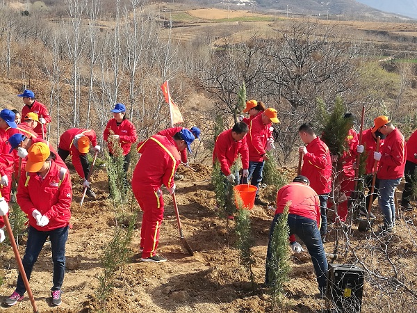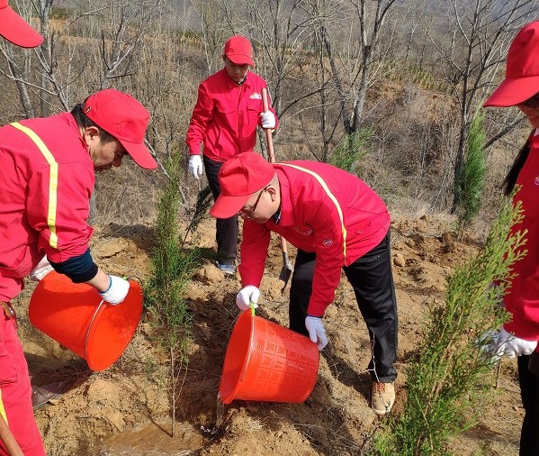 在植樹現(xiàn)場,萬達重工黨總支旗及各支部黨小組旗迎風飄揚,大家分工合作,配合默契,揮鍬鏟土、扶直苗木、培實新土、提桶澆水,栽下一株株樹苗,每道工序都做得仔細認真,現(xiàn)場呈現(xiàn)一片忙碌景象,汗水揮灑處,一株株樹苗迎風挺立,展現(xiàn)出勃勃生機。經過熱烈有序的植樹勞動,共栽植側柏、油松苗木150余棵,順利完成了義務植樹任務。