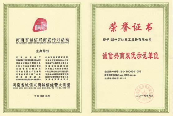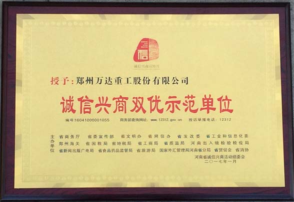 熱烈祝賀鄭州萬(wàn)達(dá)重工股份有限公司及公司董事長(zhǎng)、書記何清先生獲的“誠(chéng)信興商雙優(yōu)示范單