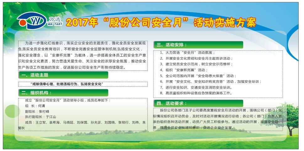 為進(jìn)一步加大安全生產(chǎn)宣傳力度,強(qiáng)化紅線意識,推動落實(shí)企業(yè)安全主題責(zé)任,弘揚(yáng)安全文化,強(qiáng)化安全理念,建設(shè)幸福萬達(dá)事業(yè),公司特于2017年7月1日—7月31日舉辦以“戒除僥幸心理、杜絕違規(guī)行為、弘揚(yáng)安全文化”為主題的安全月活動。
