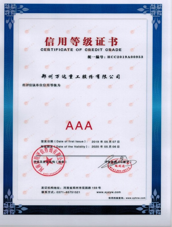 2019年5月7日,河南信用評(píng)估咨詢(xún)有限公司簽發(fā)AAA主體信用等級(jí)證書(shū)授予鄭州萬(wàn)達(dá)重工股份有限公司。在2019年的AAA主體信用評(píng)級(jí)中,鄭州萬(wàn)達(dá)重工股份有限公司順利通過(guò)復(fù)審,榮獲AAA信用等級(jí)證書(shū),保持了連續(xù)多年的AAA信用等級(jí)。
