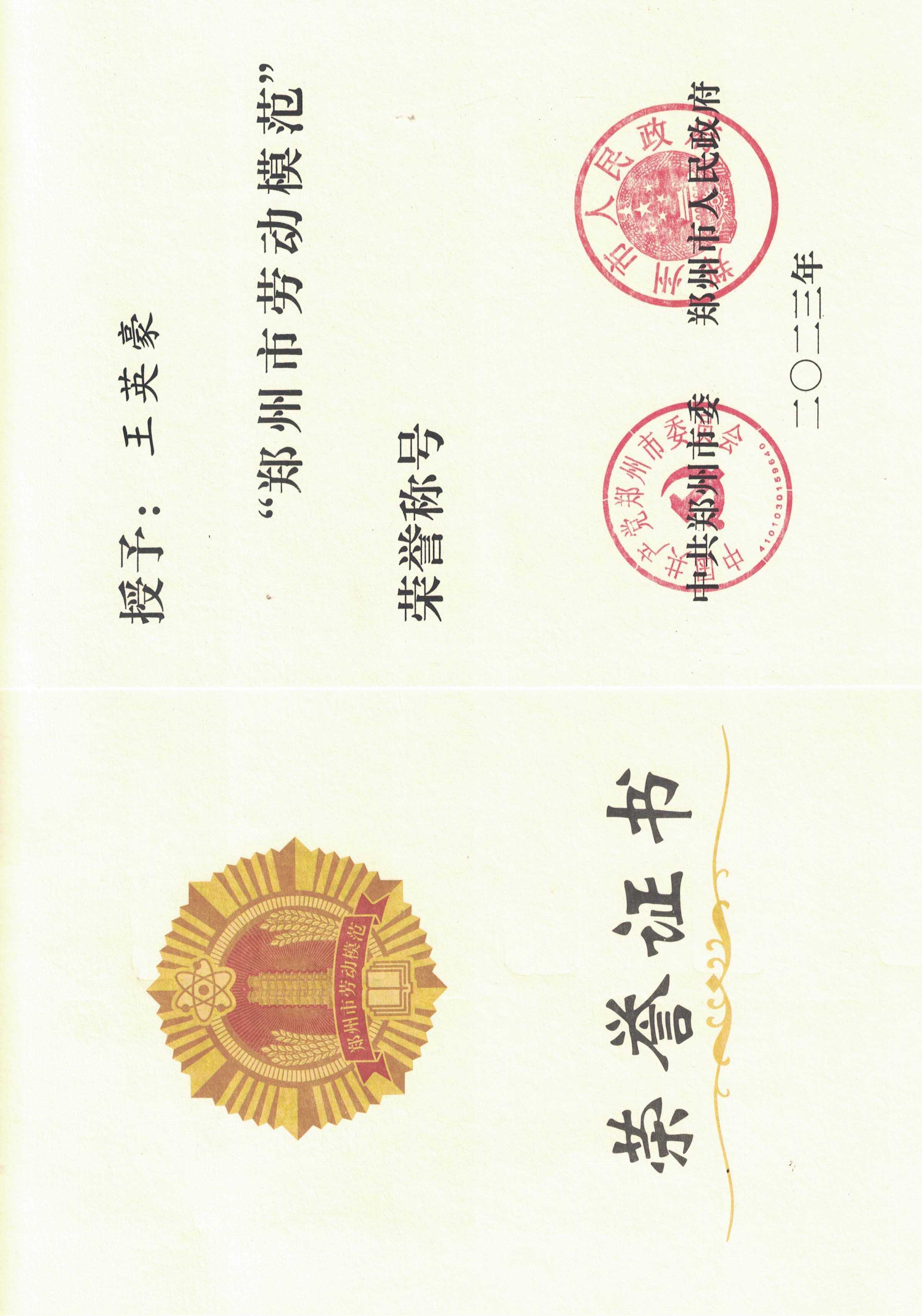 熱烈祝賀公司首席質(zhì)量官王英豪榮獲“鄭州市勞動模范”榮譽稱號及獎?wù)?