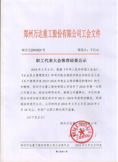 2018/03/08 3297 2018年3月5日,根據(jù)《中華人民共和國工會法》、《企業(yè)民主管理規(guī)定》和鄭州航空港經(jīng)濟綜合實驗區(qū)總工會《關于推薦評選2013-2018年度企業(yè)勞動模范的通知》的文件精神,鄭州萬達重工股份有限公司召開了2018年第一次職工代表大會。經(jīng)會議研究決定,推薦公司董事長、書記何清同志為鄭州航空港區(qū)鄭州市20132018年度勞動模...