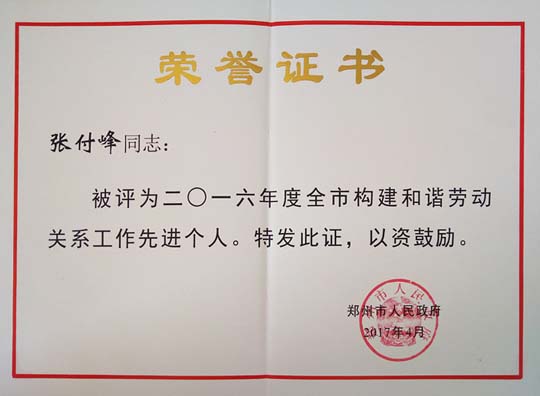 2017/06/28 684 熱烈祝 賀鄭州萬達重工股份有限公司總經(jīng)理張付峰同志被鄭州市人民政府評為2016年度鄭州市構(gòu)建和諧勞動關(guān)系工作先進個人。